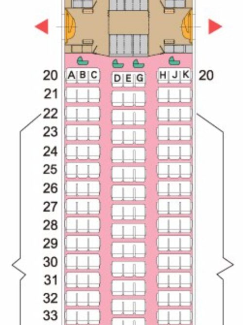 エバー航空B787-10のシートマップは、下記のとおり。エコノミークラス座席は、3-3-3の配置。
