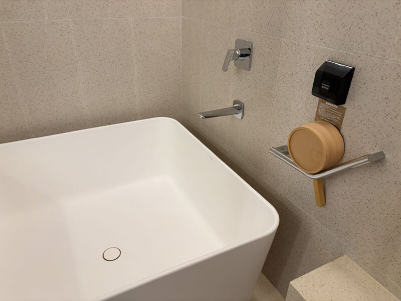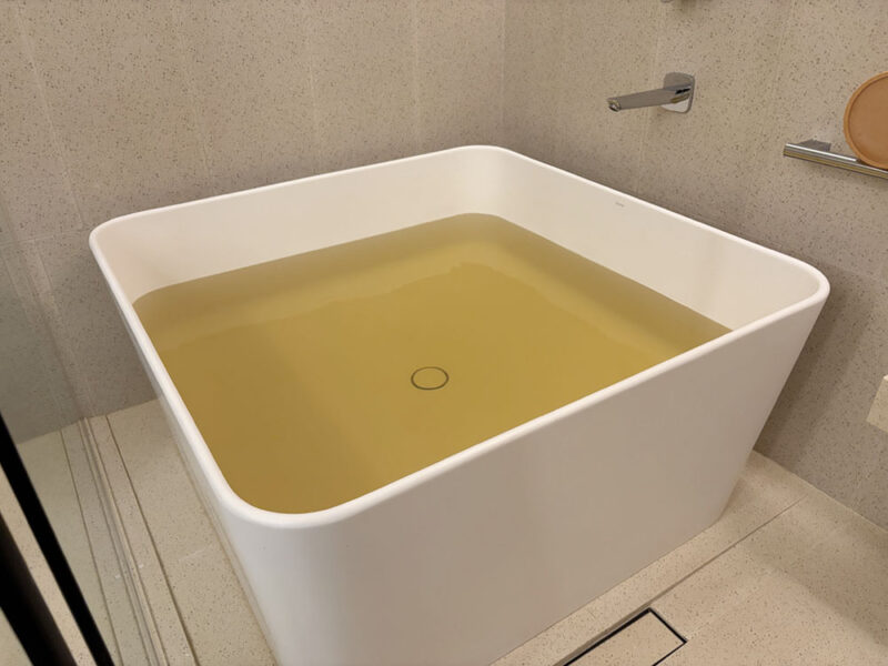 温泉の出るバスルームは、スクエアの大きなバスタブでゆったり広々、手桶もありました。