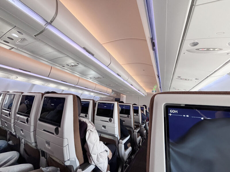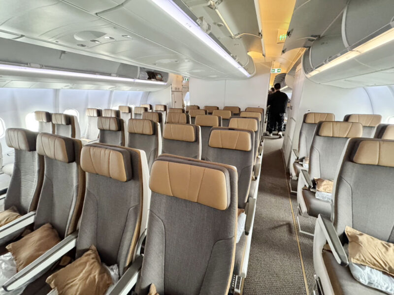 エコノミークラスの座席は、2-4-2の配置、ナチュラルシックな色目で落ち着ける空間です。