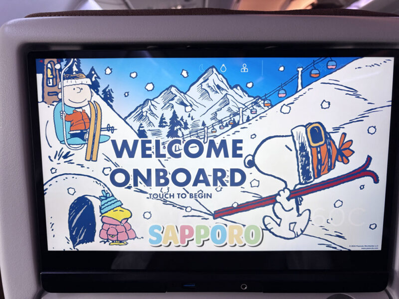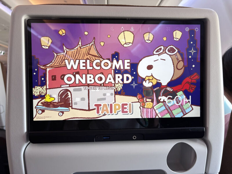 個人モニターは、タッチパネル操作も快適。台湾の漁師バッグを持っているスヌーピーがカワイイ!日本語対応の映画やアニメも楽しめました。