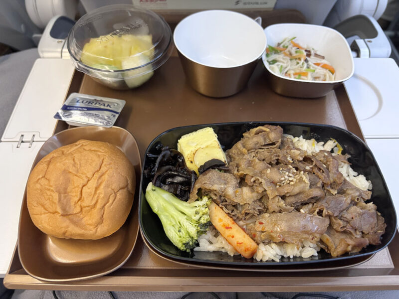 小鉢も牛丼もペンネも、アイスクリームもどれも美味しかったです。エコノミーの機内食の中では、かなりクオリティが高く、デザートまで楽しめるのが満足度高めですね。