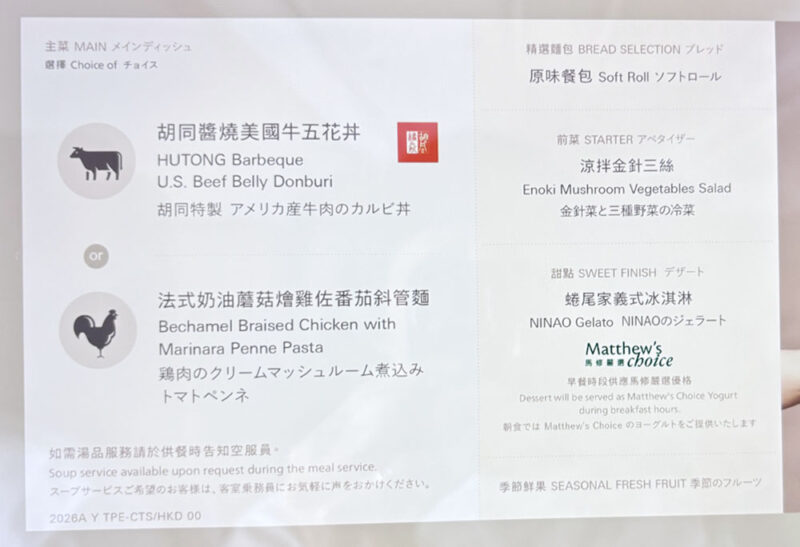 台北→新千歳のメニューをモニターで確認したところ、麻布にある焼肉と韓国居酒屋のお店、「胡同特製カルビ丼」と「鶏肉のクリームマッシュルーム煮込みトマトペンネ」の2種から選べました。