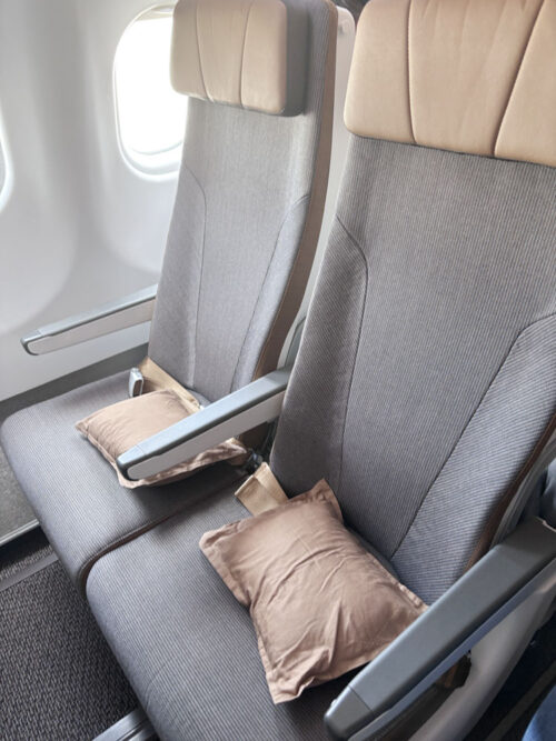 シートピッチは、32インチ(約81cm)。足元もゆとりがあり、クッションがあるのもありがたく、快適に過ごせました。